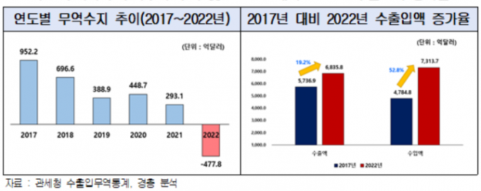 역대 무역흑자 규모가 가장 컸던 2017년(952억달러)과 비교할 때 수입액은 52.8% 증가했지만 수출액은 19.2% 늘어난 수준이다.