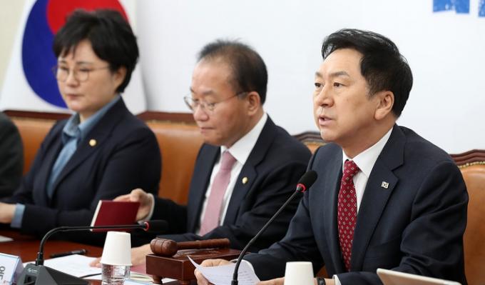 ▲ 국민의힘 김기현 대표(오른쪽)가 17일 국회에서 열린 최고위원회의에서 발언하고 있다. [뉴시스]