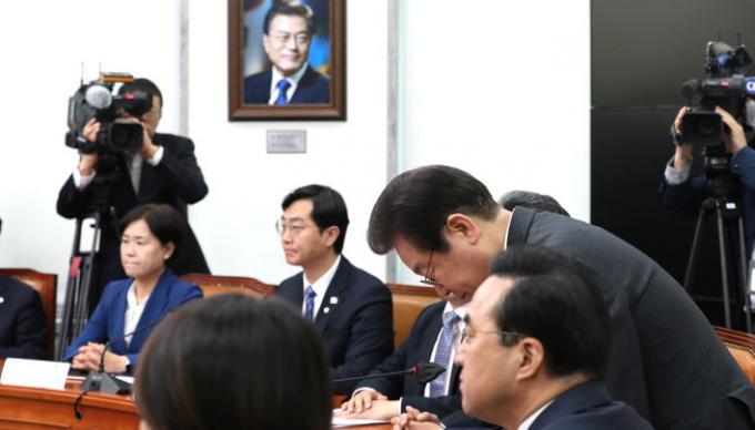 이 대표는 "실망과 심려를 끼쳐드린 점에 대해 다시 한번 사과 말씀을 드린다"며 발언 중 자리에서 일어나 머리를 숙였다.
