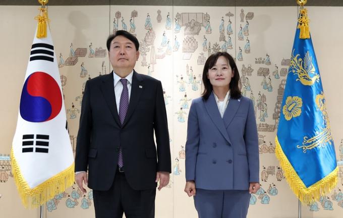▲ 윤석열 대통령이 17일 서울 용산 대통령실 청사에서 정정미 헌법재판관에게 임명장을 수여한 뒤 기념촬영하고 있다. [뉴시스]