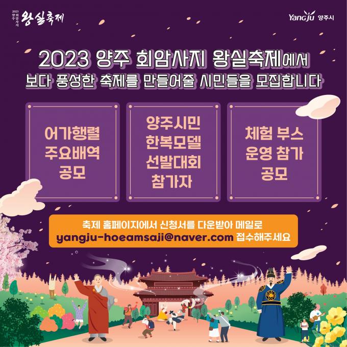 각 프로그램에 참여를 희망하는 시민이나 단체는 양주회암사지왕실축제 홈페이지에서 신청서를 다운받아 이메일로 접수하면 된다.