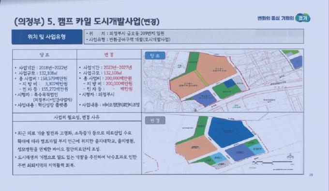한편 감사원이 조건부 승인을 취소하라고 통보함에 따라 의정부시가 해당사업을 취소했다. 그 대신 김동근 현 시장의 공약사업인 바이오첨단의료단지를 조성하겠다며 경기도에 도시개발사업 변경 신청하기 위해 공청회를 열고 사업의 필요성과 변경사유를 설명했다.