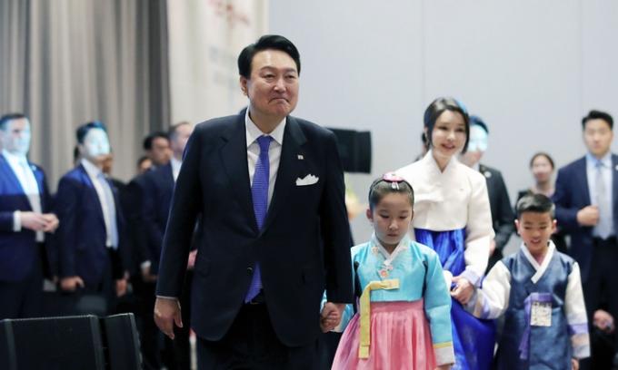 ▲ 미국을 국빈방문 중인 윤석열 대통령과 부인 김건희 여사가 24일(현지시간) 워싱턴 한 호텔에서 열린 동포 초청 만찬 간담회에서 꽃다발을 전달한 화동과 함께 입장하고 있다. [뉴시스]