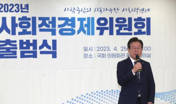 ▲ 더불어민주당 이재명 대표가 25일 국회 의원회관에서 열린 당 사회적경제위원회 출범식에서 축사하고 있다. [뉴시스]