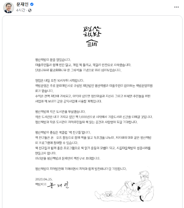 ▲ 문재인 전 대통령이 페이스북에 게재한 평산책방 개점 안내 및 초대 글. [페이스북 캡처]