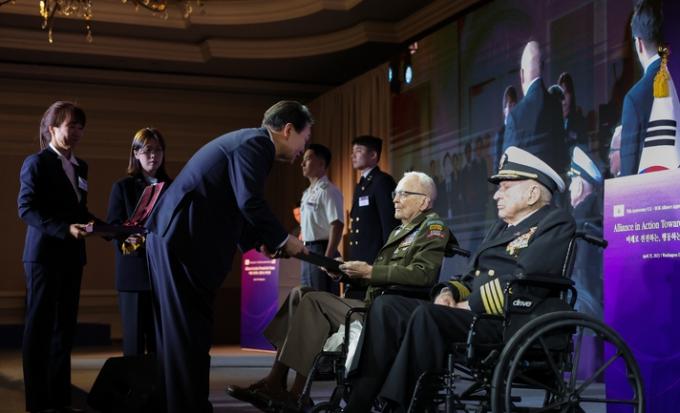 윤 대통령은 앞서 한미 동맹 70주년을 기념하기 위해 워싱턴DC 한 호텔에서 열린 오찬에 참석했다. 윤 대통령은 랄프 퍼켓 예비역 육군 대령, 앨머 로이스 윌리엄스 예비역 해군 대령에게 훈장을 수여했다. 고(故) 발도메로 로페즈 중위에게는 조카인 조셉 로페즈가 참석한 가운데 훈장을 추서했다. 윤 대통령은 퍼켓 대령의 휠체어를 직접 밀어주며 무대로 이동했다.