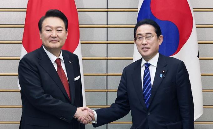 ▲ 윤석열 대통령과 기시다 후미오 일본 총리가 지난 3월 16일 도쿄 총리 관저에서 열린 한일 확대정상회담에서 악수하고 있다. [뉴시스]