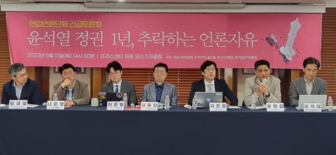 나준영 한국영상기자협회장은 11일 오후 2시 30분 서울 중구 프레스센터에서 열린 '윤석열 정권 1년, 추락하는 언론자유' 토론회에서 이같이 밝혔다. 이날 토론회는 윤 대통령 취임 1주년을 맞아 언론자유 침해 사례를 돌아보고 언론 자유를 모색하는 자리로 방송기자연합회, 전국언론노동조합, 한국기자협회, 한국영상기자협회가 공동으로 마련했다.