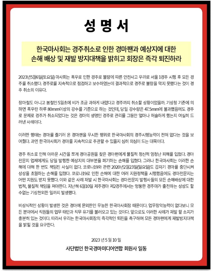 이어 "앞으로도 이러한 사례가 재발할 소지가 충분히 있기 때문에 한국마사회장의 즉각적인 퇴진을 촉구하며 모든 경마팬에게 재발방지대책을 밝힐 것을 요구한다"고 했다.