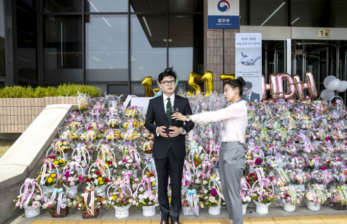 이날 법무부 청사 앞에는 한 장관 지지자들이 보낸 꽃다발과 응원 문구가 수북이 쌓여 있었다.