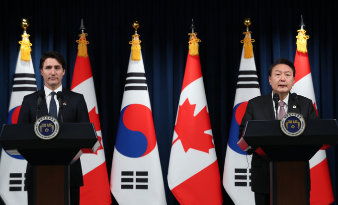 ▲ 윤석열 대통령과 쥐스탱 트뤼도 캐나다 총리가 17일 서울 용산 대통령실 청사에서 정상회담 후 공동기자회견을 하고 있다. [뉴시스]