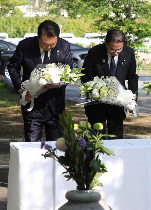 참배를 마친 윤 대통령과 기시다 총리는 피해자들을 향해 목례한 뒤 차량으로 이동해 한일 정상회담 회담장으로 향했다.