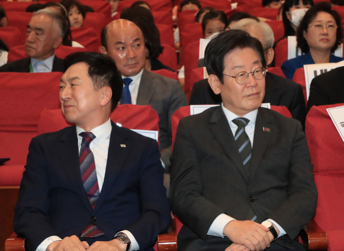 ▲ 국민의힘 김기현 대표(왼쪽)와 더불어민주당 이재명 대표가 지난 4일 오후 서울 여의도 국회에서 열린 국회 어린이 안전 포럼 주최 어린이 안전 헌장 선포식에 참석해 서로 다른 곳을 바라보고 있다. [뉴시스]