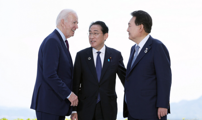 ▲ 윤석열 대통령이 지난 21일 G7(주요 7개국) 정상회의가 열린 일본 히로시마의 그랜드프린스호텔에서 조 바이든 미국 대통령, 기시다 후미오 일본 총리와 만나 3국 정상회담을 하고 있다. [뉴시스]