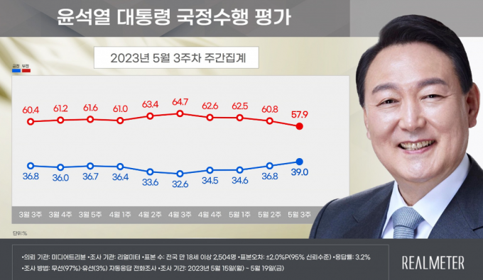 리얼미터가 22일 발표한 여론조사에 따르면 윤 대통령 국정 수행에 대한 긍정 평가(지지율)는 39.0%를 기록했다. 지난주 조사와 비교해 2.2%포인트(p) 뛰었다.