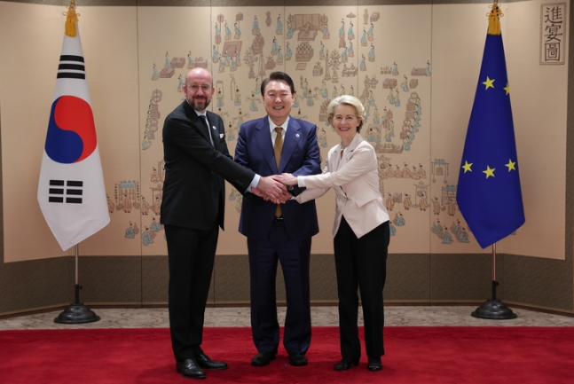 윤석열 대통령은 22일 유럽연합(EU) 지도부와 정상회담을 갖고 '그린·보건·디지털' 3대 분야에서 협력을 강화하기로 합의했다.