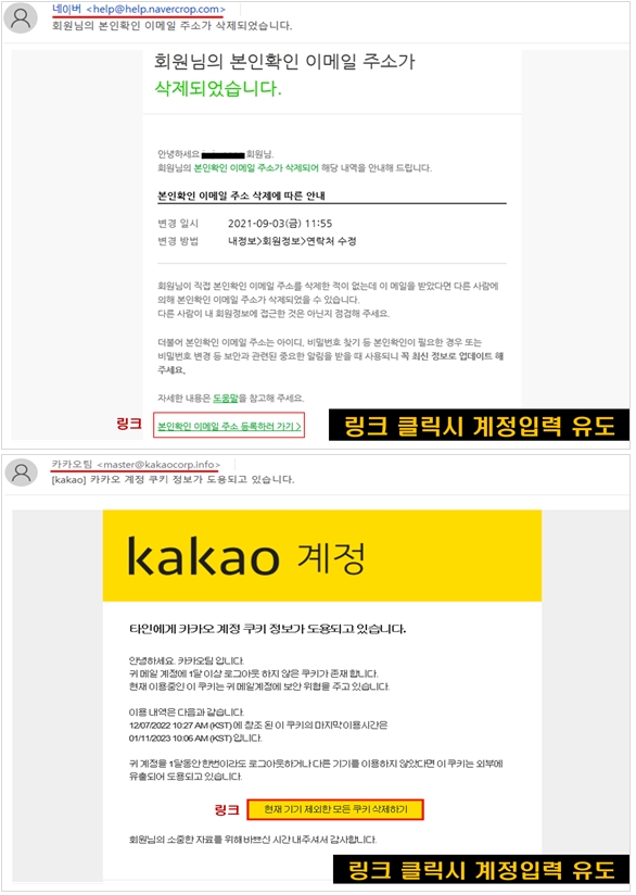 실제로 북한은 메일 발송자명을 '네이버', 'NAVER고객센터', 'Daum게임담당자' 등 포털사이트 관리자인 것처럼 위장했다. 발신자 메일주소도 'naver'를 'navor'로, 'daum'을 'daurn'로 표기했다.