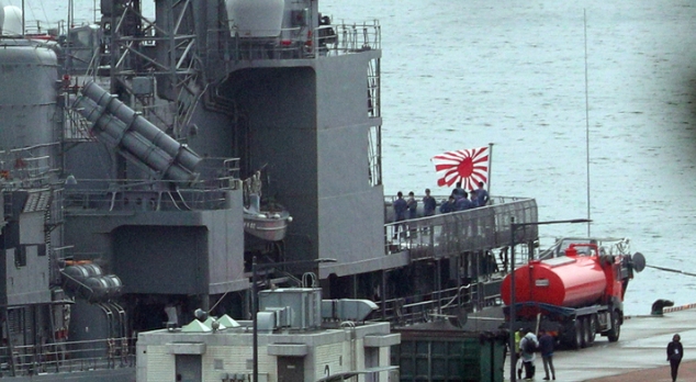 전하규 국방부 대변인은 지난 25일 가진 정례브리핑에서 "통상적으로 외국항에 함정이 입항할 때 그 나라 국기와 그 나라 군대 또는 기관을 상징하는 깃발을 다는 것으로 알고 있다"며 "이건 전 세계적으로 통상적으로 통용되는 공통적인 사항"이라고 설명했다.