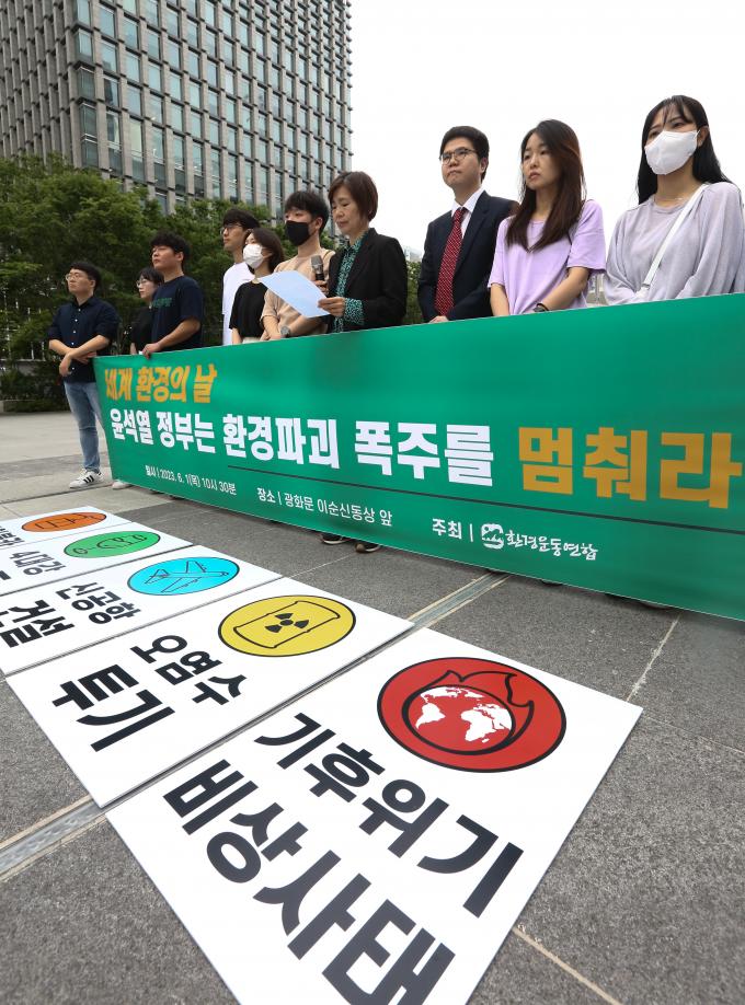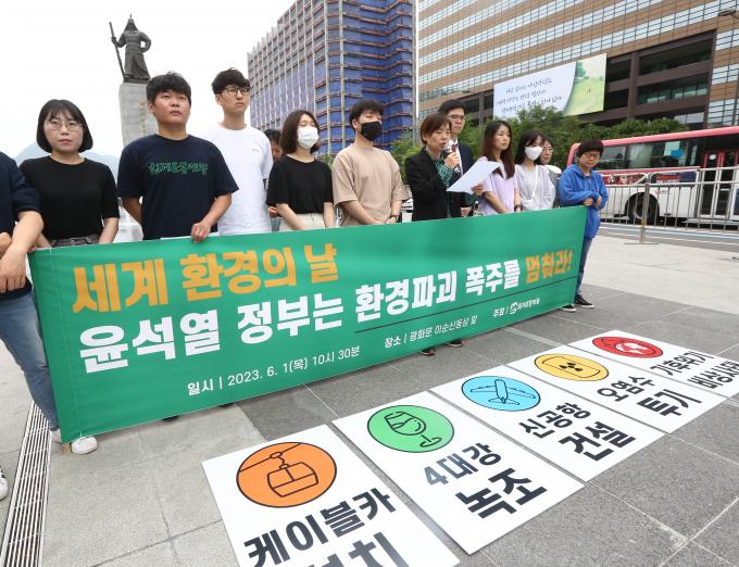 환경운동연합이 6월 5일 '세계 환경의 날'을 기념해 1일 오전 광화문 이순신장군상 앞에서 '세계 환경의 날, 윤석열 정부는 환경 파괴 폭주를 멈춰라!'는 기자회견을 가졌다.