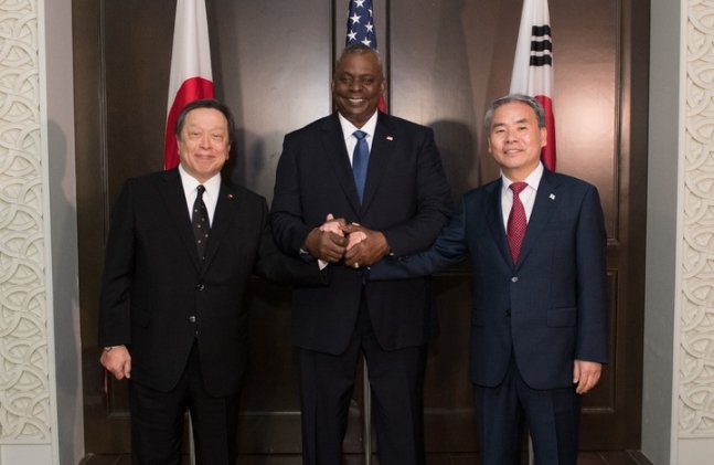 이종섭 국방부 장관과 로이드 오스틴 미국 국방장관, 하마다 야스카즈 일본 방위상은 지난 3일(현지시간) 싱가포르에서 열리고 있는 제20차 아시아안보회의(일명 샹그릴라 대화)에서 만났다. 샹그릴라 호텔에서 3자 회담을 열고 올해 안에 북한 미사일 경보 정보 실시간 공유 체계 가동하기로 합의했다.