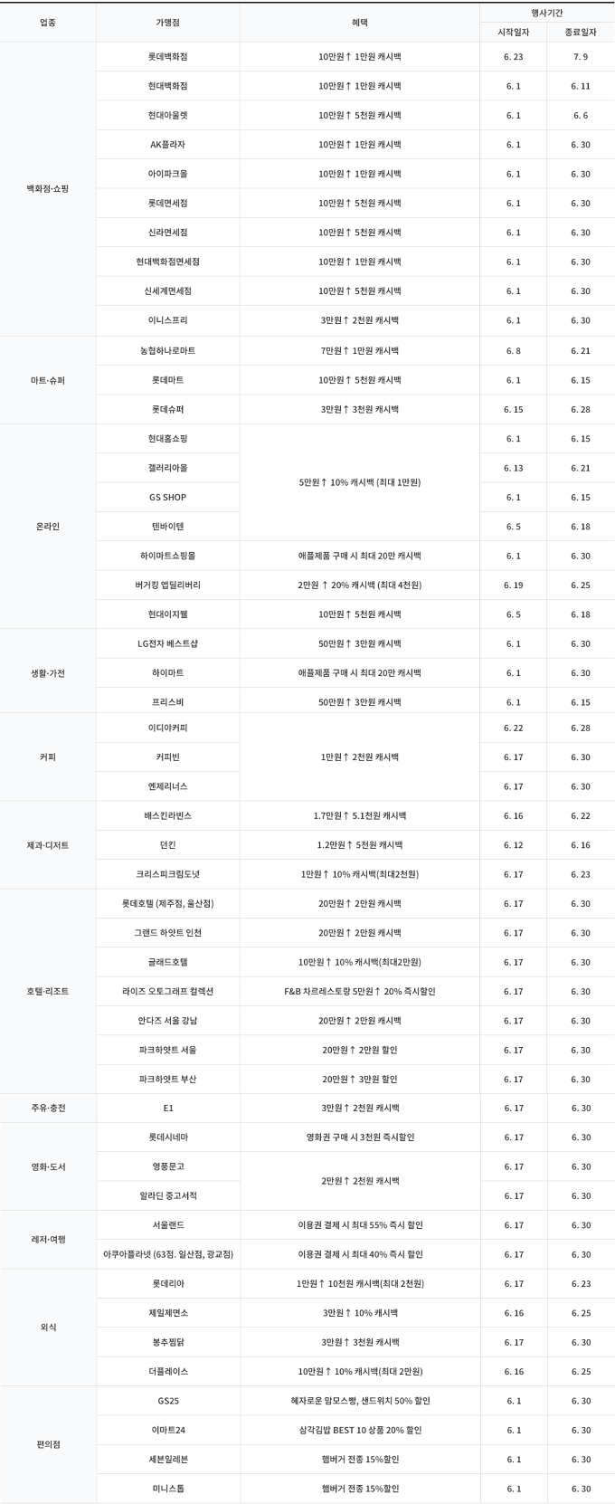 카페 및 외식 혜택도 다양하다. △이디야커피 △커피빈 △엔제리너스에서는 1만 원 이상 결제 시 최대 2000원의 캐시백이 주어지며, 더플레이스에서는 10만 원 이상 결제 시 최대 2만 원까지 10% 캐시백이 제공된다. 그 외 △배스킨라빈스 △던킨 △크리스피크림도넛 △롯데리아 등에서도 이용 금액에 따라 캐시백 혜택을 누릴 수 있다.