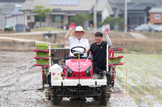 尹, 쌀 생산 현장 찾아 청년과 모내기…직접 이앙기 탑승도