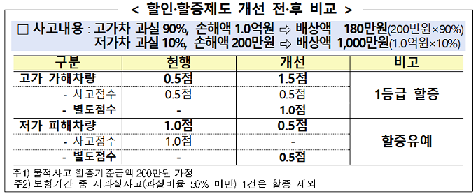 고가 가해 차량은 기존 사고 점수에 별도 점수 1점을 가산해 보험료를 할증하고 저가 피해 차량은 기존 사고 점수가 아닌 별도 점수 0.5점만 적용해 보험료 할증을 유예한다.