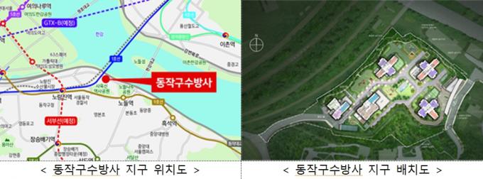 동작구 수방사 지구는 한강변에 위치해 한강 조망을 누릴 수 있다. 노량진역(1·9호선)·노들역(9호선) 역세권에 위치하며 올림픽대로·강변북로·한강대교가 가깝다. 인근에 사육신역사공원이 있어 주변환경이 쾌적하고 종합병원·대형상업시설 등이 몰려 있는 여의도 생활권을 누릴 수 있다.