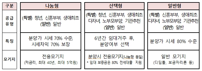 공급 유형은 △시세차익 70%를 보장하는 나눔형(5286가구) △6년 임대거주 후 분양 받는 선택형(2440가구) △시세의 80% 수준으로 분양하는 일반형(2350가구)으로 나뉜다. 선택형은 9월에 처음 공급할 예정이다.