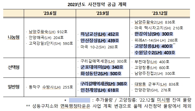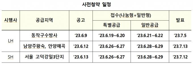 6월 사전청약지는 △서울 동작구 수방사(255가구, 일반형, LH, 9일 공고) △경기 남양주왕숙(932가구, 나눔형, LH, 12일 공고) △경기 안양매곡 (204가구, 나눔형, LH, 12일 공고) △서울 고덕강일 3단지(590가구, 토지임대부형, SH, 13일 공고)다.