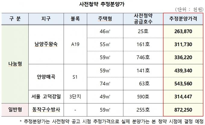 사전청약 추정분양가는 △남양주왕숙이 46㎡(25가구) 2억6387만 원, 55㎡(161가구) 3억1173만 원, 59㎡(746가구) 3억3622만 원 수준이다. △안양매곡은 59㎡(141가구) 4억3934만 원, 74㎡(63가구) 5억4356만 원 정도다. △고덕강일 3단지는 49㎡(590가구) 3억1400만 원 △동작구 수방사는 8억7225만 원이다.