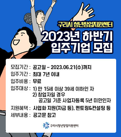구리시는 오는 21일까지 하반기 청년창업지원센터 신규 입주기업을 모집한다고 7일 밝혔다.