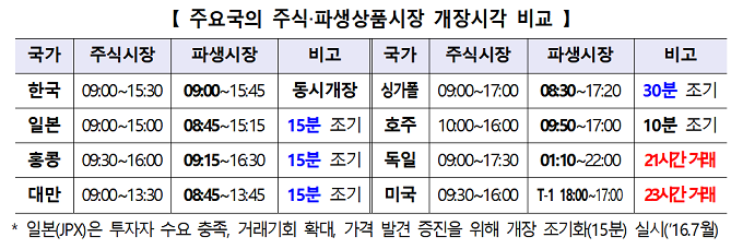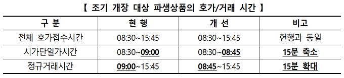 파생상품시장 조기개장으로 파생상품시장의 정규거래시간은 15분 확대하고 시가단일가시간은 현행 30분에서 15분으로 축소한다.