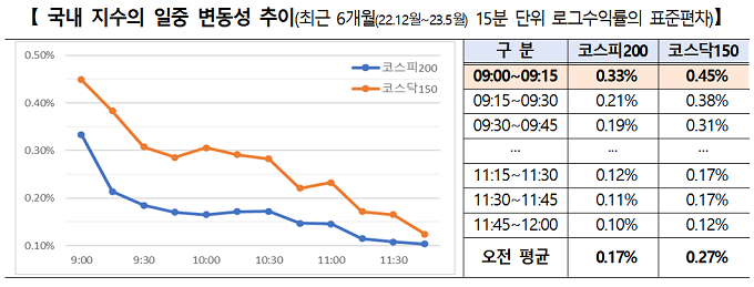 또한 현물시장과 선물시장이 동시에 개장하면서, 개장 전에 발생한 주요 변동사항이 선물시장에서 미리 조정되지 못하고 주식시장에서 바로 가격발견이 이뤄지는 과정에서 일증 주식시장 가격변동성 대비 주식시장 개장 초기 15분간의 변동성이 높게 나타났다.