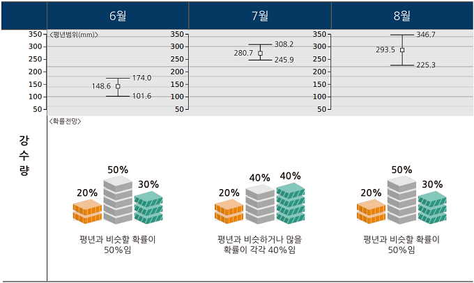 기상청도 최근 발표한 3개월(6~8월) 기상 전망에서 올 여름 엘니뇨가 발생해 한반도 부근에 저기압성 순환이 강화되면서 남쪽에서 많은 양의 수증기가 유입돼 7월 강수량이 평년보다 많을 수 있다고 예측했다. 6월과 8월은 평년과 비슷할 확률 50%, 더 많을 확률 30%이고 7월은 각각 40%씩이다.