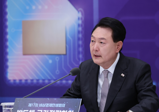 윤 대통령은 이날 청와대 영빈관에서 제17차 비상경제민생회의를 겸한 '반도체 국가전략회의'를 주재하며 "한 치 앞도 내다볼 수 없는 반도체 전쟁이 펼쳐지고 있다"고 말했다.