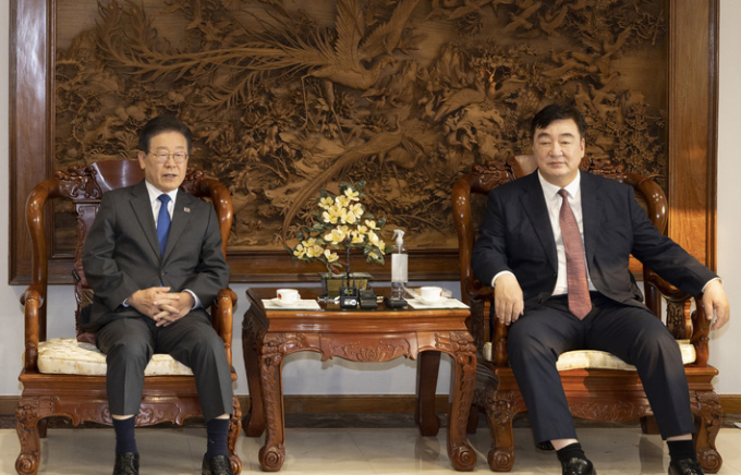 ▲ 더불어민주당 이재명 대표(왼쪽)가 8일 저녁 서울 성북구 중국대사관저에서 싱하이밍 주한중국대사를 만나 인사말을 하고 있다. [뉴시스]