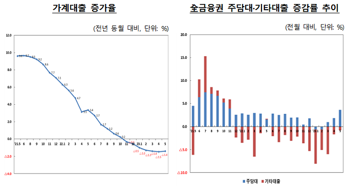 금융위는 지난 5월 중 전 금융권 가계대출 잔액의 전년 동월 대비 증감률은 -1.4%로 지난해 11월 이후 감소세가 지속되고 있다고 설명했다.