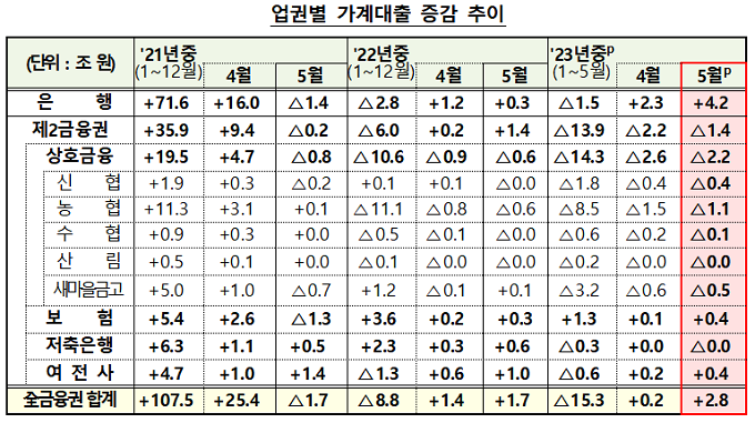 업권별로 살펴보면 은행권 가계대출은 4조2000억 원 늘며 2개월째 증가세를 유지했다.