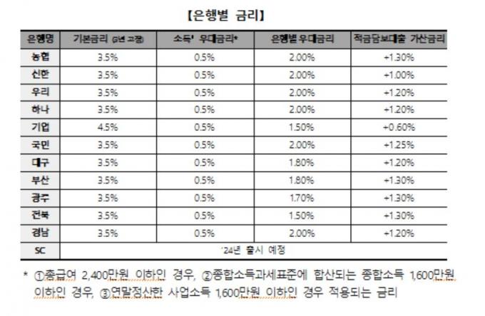 대부분 기본금리 3.5%, 소득·은행별 우대금리 2.5%