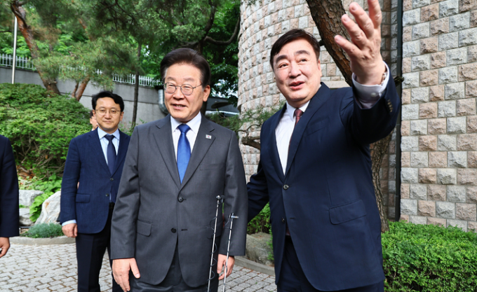 ▲ 더불어민주당 이재명 대표가 지난 8일 서울 성북구 중국대사관저에서 싱하이밍 주한중국대사와 만나 안내를 받고 있다. [뉴시스]