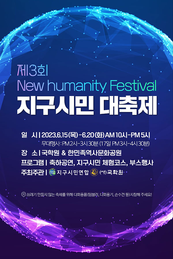 사단법인 국학원(원장 권나은)과 공동 주최하는 이번 축제에 대해 "지구시민대축제는 범지구적인 위기를 극복하고, 인류의 대화합과 공생을 기원하는 행사"라고 주최 측은 설명했다.