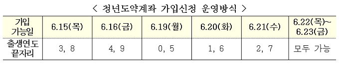 가입신청은 오는 15일부터 23일까지 가입신청이 가능하다. 첫 5영업일(6월 15일~6월 21일)에는 출생연도를 기준으로 5부제에 따라 가입신청을 할 수 있다. 22일과 23일에는 출생연도와 관계없다. 가입이 가능하다고 안내받은 청년은 1개 은행을 선택해 7월 10일부터 21일 중 계좌개설이 가능(1인 1계좌)하다.