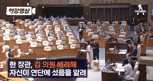 그러자 국무위원석에 앉아있던 한 장관은 걸어나와 답변대 마이크 앞에 서더니 먼저 "의원님, 한동훈 법무부 장관 나와있습니다"라고 밝혔다. 시각장애인인 김 의원을 배려해 답변대에 섰음을 알린 것이다.