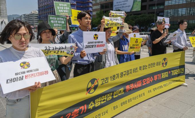 고리 2호기 수명 연장과 후쿠시마 오염수 해양투기를 반대하는 기자회견이 16일 오전 서울 광화문 광장에서 열렸다.