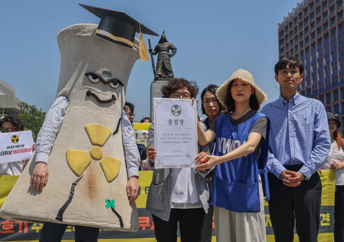 ▲ 16일 오전 서울 광화문 광장에서 열린 고리2호기 수명 연장과 후쿠시마 오염수 해양투기를 반대하는 기자회견에서 환경운동가들이 고리2호기 수명연장을 반대하며 졸업장을 주는 퍼포먼스를 하고 있다. [이상훈 선임기자]