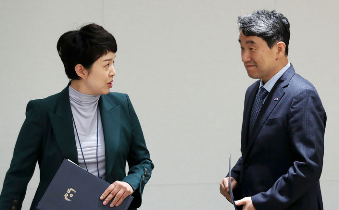 ▲ 이주호 사회부총리 겸 교육부 장관(오른쪽)과 대통령실 김은혜 홍보수석이 지난 15일 서울 용산 대통령실 청사에서 교육개혁 현안 추진 상황을 브리핑하기 위해 단상으로 향하며 대화하고 있다. [뉴시스]