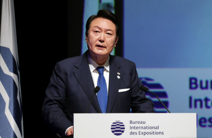 ▲ 윤석열 대통령이 20일(현지시간) 프랑스 파리에서 열린 제172차 국제박람회기구(BIE) 총회의 2030 세계박람회 경쟁 프레젠테이션(PT)에서 부산 엑스포 유치를 위한 영어 연설을 하고 있다. [뉴시스]