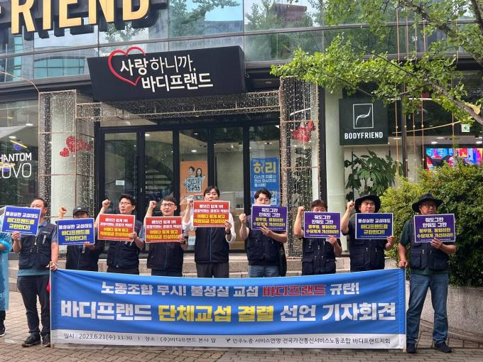 민주노총 산하 전국가전통신서비스노동조합 바디프랜드지회는 이날 서울 강남구 도곡동 본사 앞에서 기자회견을 열고 "사측의 무성의한 태도로 1년간 끌어온 교섭이 결렬됐다"며 "사측 태도 변화가 없다면 투쟁에 직면하게 될 것"이라고 경고했다.