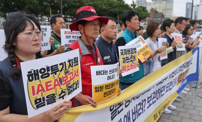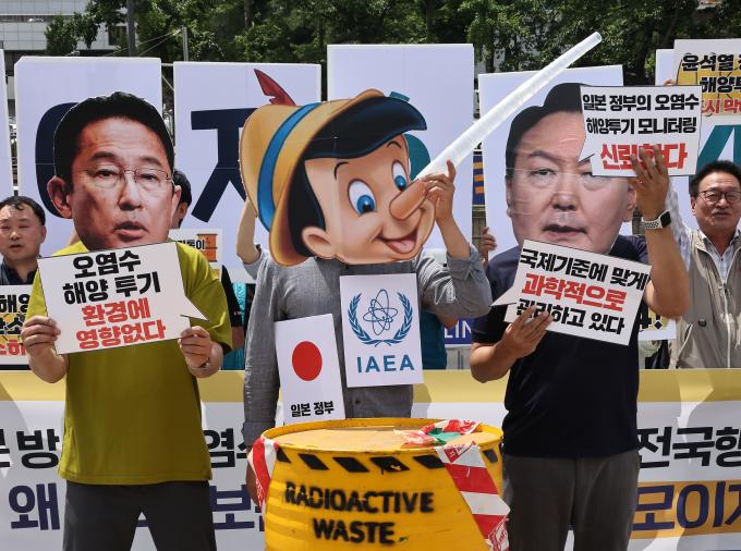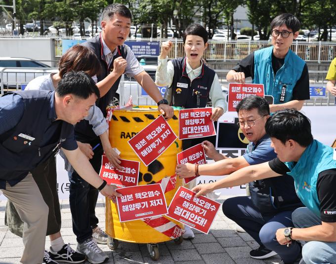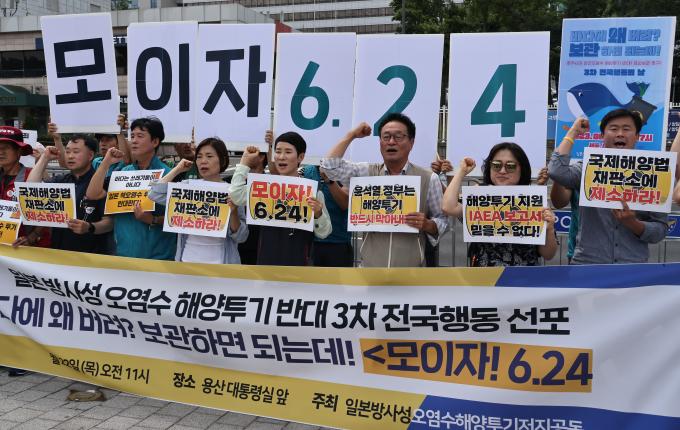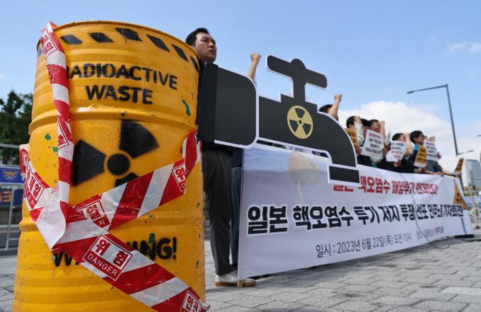일본 후쿠시마 제1원전에 보관 중인 핵 오염수 해양투기가 곧 현실로 다가오는 가운데 22일 용산 대통령 집무실 앞에서는 이를 반대하는 기자회견이 연이어 열렸다.